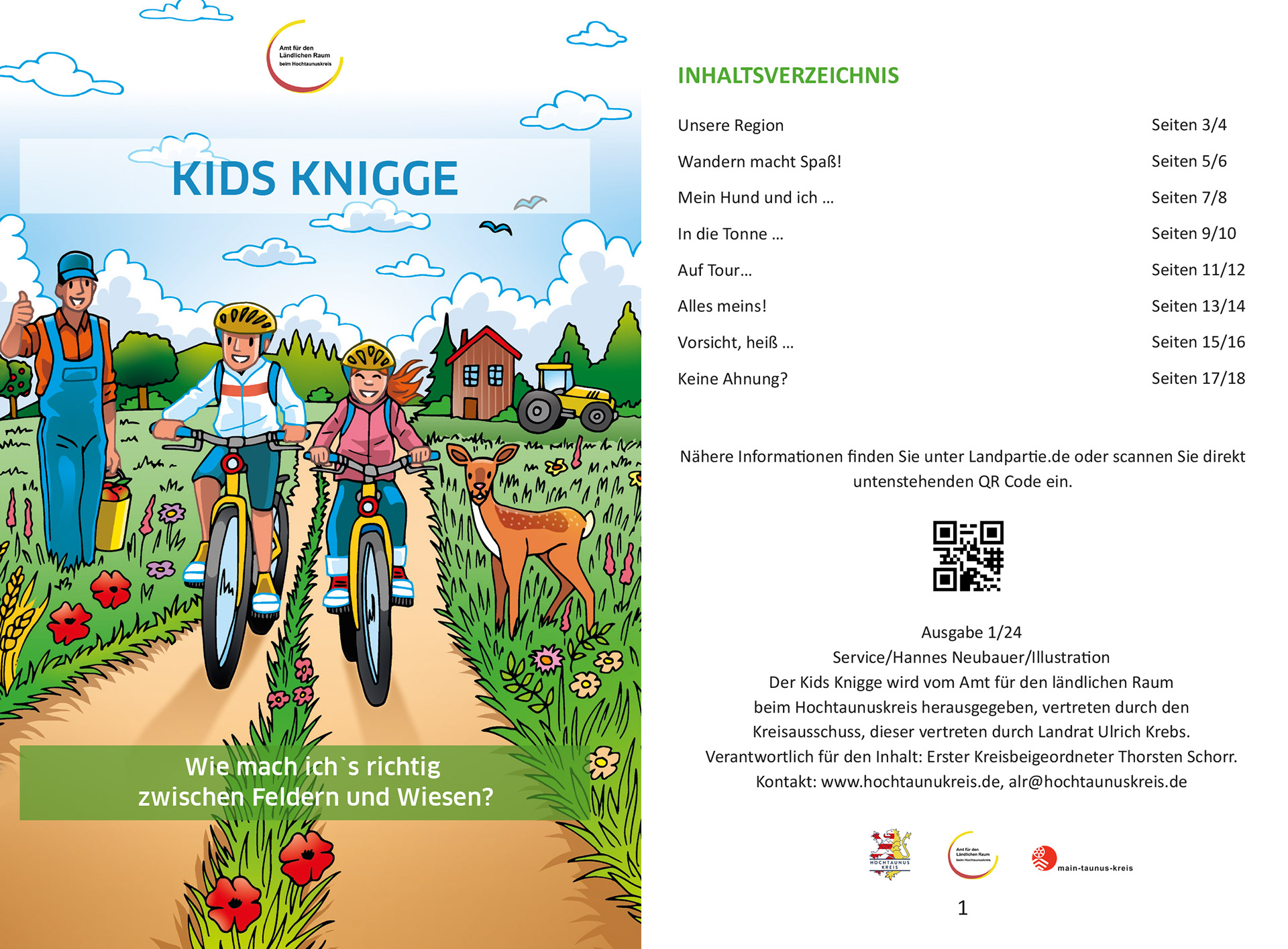 Kids Knigge – die neue Broschüre des Amts für den ländlichen Raum des Hochtaunuskreises leistet Aufklärungsarbeit für Kinder im Umgang mit der Natur. Die 20-seitige Broschüre im handlichen DIN A 6 Format zeigt spielerisch Verhaltensregeln in Feld und Flur. Die liebevoll illustrierte Broschüre richtet sich primär an Wanderer, Radfahrer und Hundehalter. Aber auch der richtige Umgang mit Müllentsorgung sowie Grillen in der Natur werden thematisiert. Die Broschüre erschien erstmalig zum diesjährigen Laurentius Markt in Usingen. Hier stellte das Amt für den ländlichen Raum außerdem das Projekt „Rücksicht auf unseren Feldwegen“ vor.